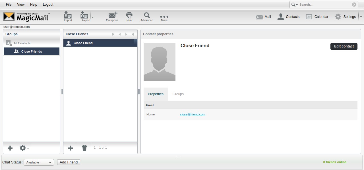 The address book is divided into two sections. On the left, instead of the folder list you will see a list of your contact groups. Groups are used to help organize your contacts. If you click on any one of groups, you will then see a list of contacts that are in that group in the pane to the right.