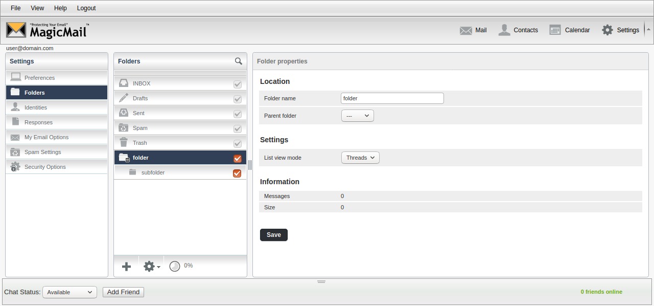 Clicking on a folder will give you more options for it. You are able to change the name of some folders, change the parent folder, and specify whether the folder should show messages as a list or threaded by default. You can uncheck the checkbox next to a folder in order to hide that folder from view when viewing your messages